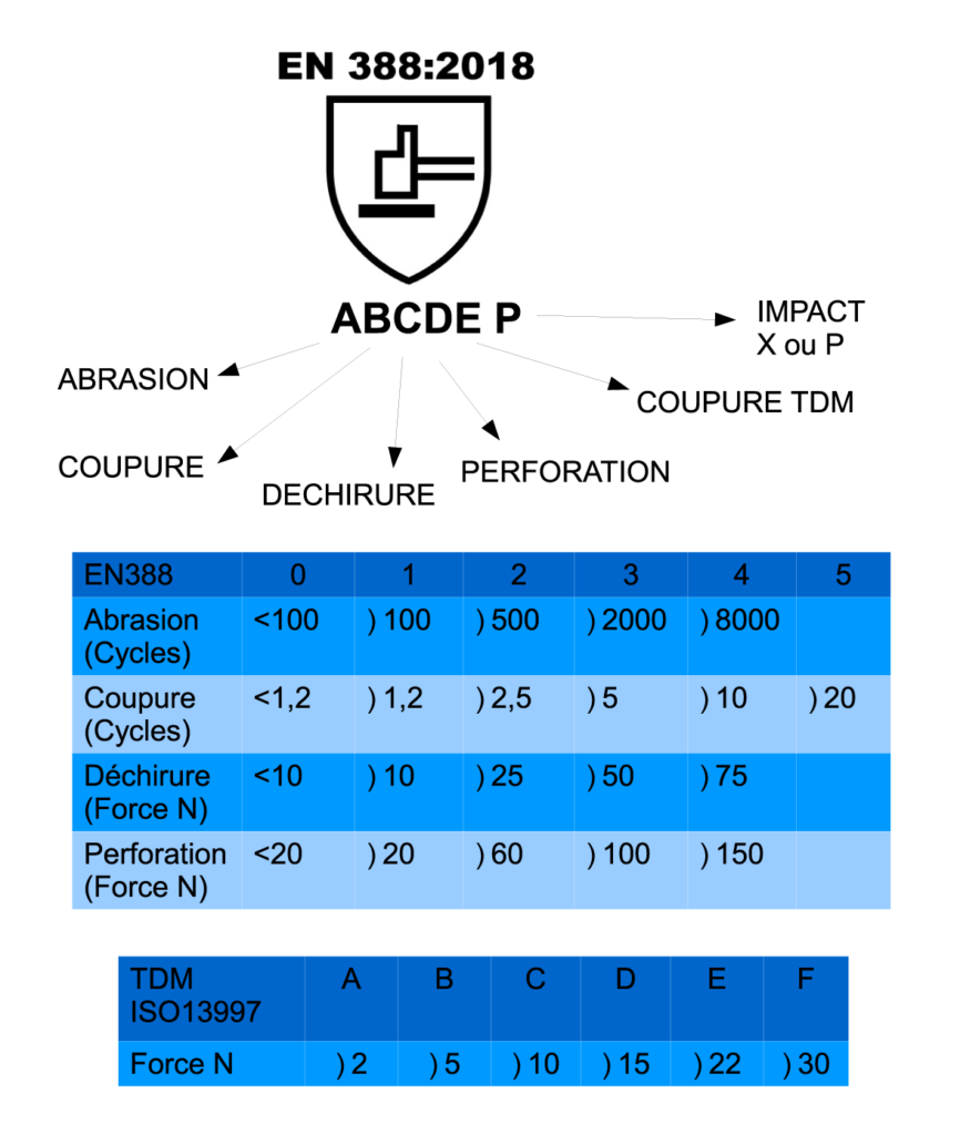 Domaine d’application : La présente norme européenne spécifie les exigences, méthodes d’essai, marquages et informations à fournir concernant les gants de protection contre les risques mécaniques d’abrasion, de coupure par tranchage, de déchirure, de perforation et, le cas échéant, de choc. La présente norme est destinée à être utilisée conjointement avec l’EN 420. Les méthodes d’essai élaborées dans la présente norme peuvent également s’appliquer aux manchettes.